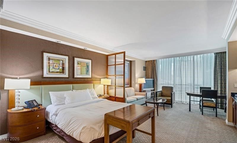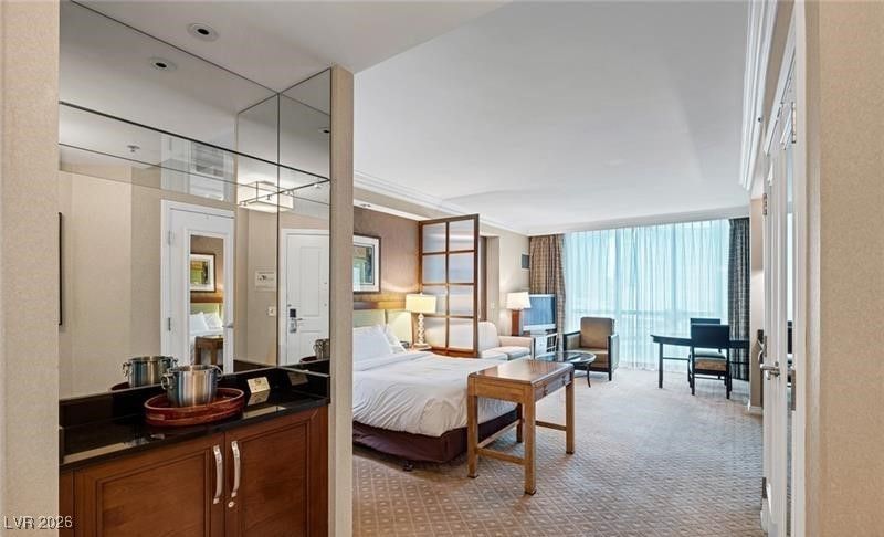 Studio Residence in Tower 2 at The Signature at MGM Grand. Perched high on the 11th floor, this beautifully finished, fully furnished studio offers sweeping views of the resort pool below and the Las Vegas Strip beyond. The thoughtfully designed living area features refined finishes, a comfortable sitting space, and a built-in entertainment center, creating a relaxed yet upscale atmosphere. The well-appointed kitchenette includes stainless steel appliances, granite countertops, custom cabinetry, and ample storage?ideal for extended stays. The spacious bathroom is enhanced by elegant stone finishes, a double vanity, separate shower and a luxurious jetted Jacuzzi tub. The unit comfortably sleeps four with a plush king bed and a pull-out sleeper sofa, and includes a large closet. Currently enrolled in a third-party rental pool, generating approximately $3,200 per month in income.
